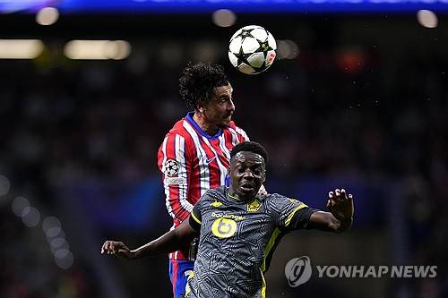 Lille's Mohamed Bayo, right, challenges Atletico Madrid's Jose Gimenez during the Champions League opening phase soccer match between Atletico Madrid and Lille at the Metropolitano stadium in Madrid, Spain, Wednesday, Oct. 23, 2024. (AP Photo/Manu Fernandez)