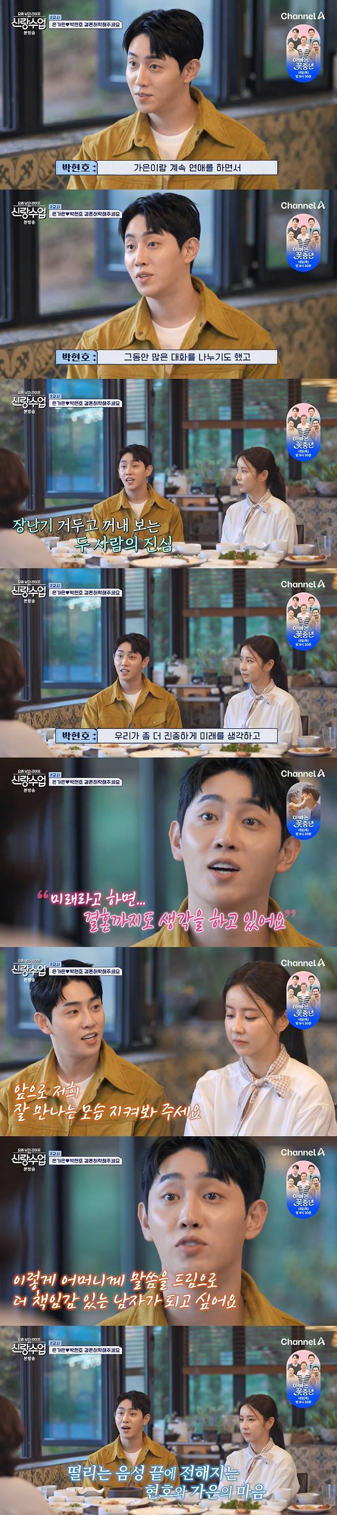 박현호는 "가은이랑 계속 연애하면서 많은 대화를 많이 나누며 생각을 한 게, 우리가 결혼을 전제로 만나보고 싶다. 이걸 어머니한테 말하고 싶었다"라며 "이렇게 말함으로서 내가 뱉은 말을 지키기 위해 노력할 거다. 더 진중하게 만나고 싶어 말씀드리자고 마음 먹고 어머니를 뵌 거다"라고 고백했다.