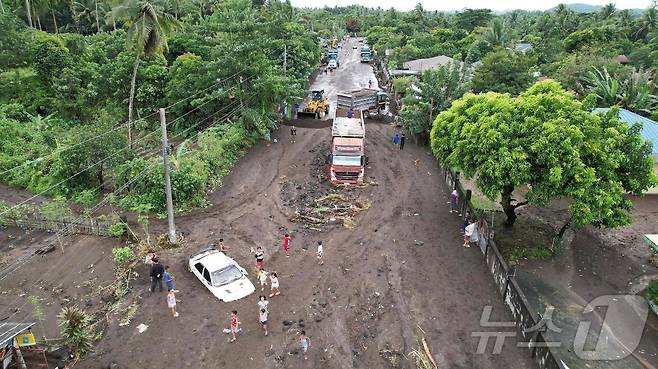 (기노바탄 AFP=뉴스1) 우동명 기자 = 23일(현지시간) 태풍 짜미가 강타해 폭우가 쏟아진 필리핀 알베이주 기노바탄에서 마욘 화산의 화산재에 묻힌 차량들이 보인다. 2024.10.24