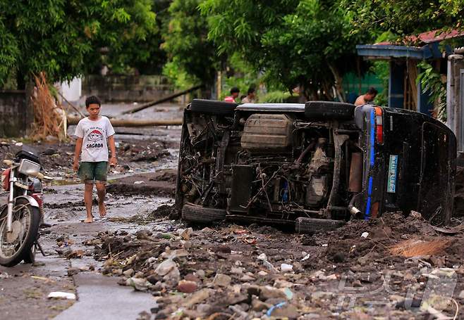 (오아스 AFP=뉴스1) 우동명 기자 = 23일(현지시간) 태풍 짜미가 강타해 폭우가 쏟아진 필리핀 알베이주 오아스에서 파손된 채 전복된 차량이 보인다. 2024.10.24