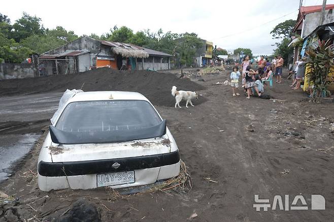 [기노바탄=AP/뉴시스] 제20호 태풍 짜미가 필리핀을 강타해 23일(현지시각) 알베이주 기노바탄 마을에 있던 자동차 한 대가 폭우로 흘러내린 마욘 화산 화산재에 묻혀 있다. 2024.10.24.