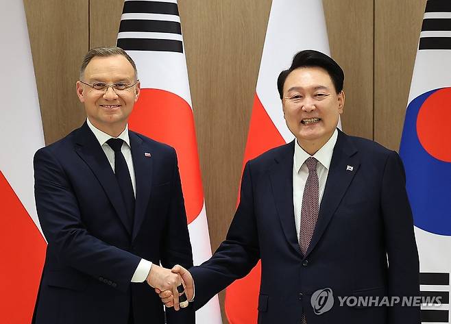 (서울=연합뉴스) 홍해인 기자 = 윤석열 대통령이 24일 서울 용산 대통령실에서 열린 한·폴란드 확대 정상회담에서 안제이 두다 폴란드 대통령과 악수하며 기념 촬영을 하고 있다. 2024.10.24 [대통령실통신사진기자단]