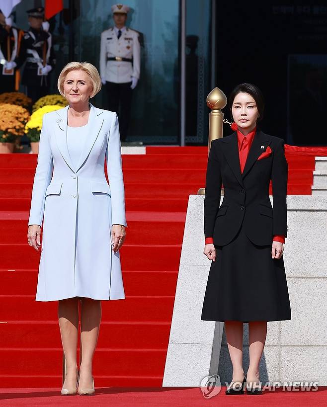 (서울=연합뉴스) 홍해인 기자 = 윤석열 대통령의 부인 김건희 여사가 24일 서울 용산 대통령실 앞 잔디마당에서 열린 안제이 두다 폴란드 대통령 국빈 방한 공식 환영식에서 아가타 코른하우저 두다 여사와 함께 자리하고 있다. 2024.10.24