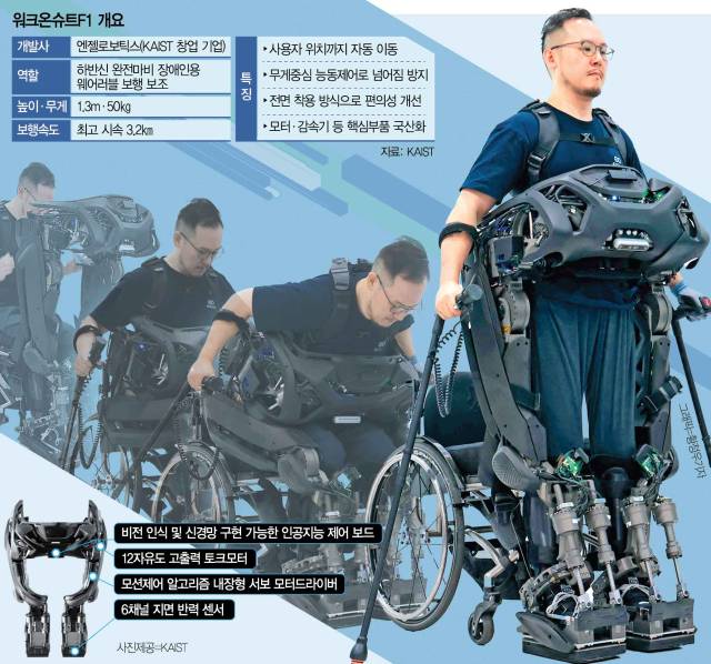 KAIST와 교내 창업 기업 엔젤로보틱스는 24일 대전 대덕구 ‘사이배슬론 2024 아시아허브’에서 차세대 웨어러블(착용형) 로봇 ‘워크온슈트F1’을 공개했다. 웨어러블 로봇은 노인과 환자의 보행과 재활 치료에 상용화됐지만 스스로 사용자에게 다가와 자동으로 착용까지 해주는 기술은 워크온슈트F1이 세계 최초라고 연구진은 강조했다. 마치 영화 ‘마블’ 시리즈의 ‘아이언맨’ 슈트처럼 스스로 사람에게 달라붙어 입혀지는 기술을 세계 최초로 구현한 것이다.