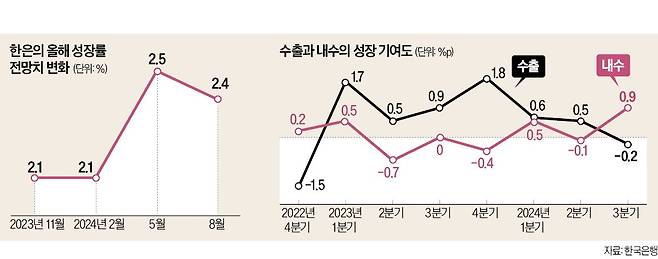 3분기 성장률이 기대에 미치지 못해 한은의 경제전망도 수정이 불가피해졌다. 올해 2.4% 성장률 달성이 어려워진 데다 올해 성장률 변동에 따라 내년 2.1% 성장률도 불확실해졌다. 한은은 “2024~2025년 성장률과 관련한 불확실성이 커졌다”며 “내수 회복 속도, 주요국 경기와 IT 사이클, 글로벌 교역 조건 변화 등을 면밀히 점검해 다음달 다시 전망할 것”이라고 밝혔다.