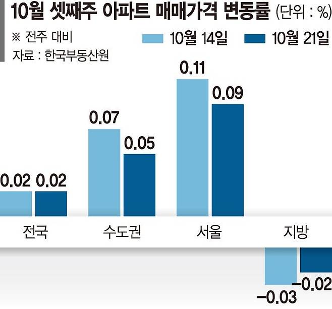 서울 아파트값 상승폭이 0.10% 밑으로 떨어진 것은 지난 6월 첫째주 0.09%를 기록한 후 20주 만에 처음이다.