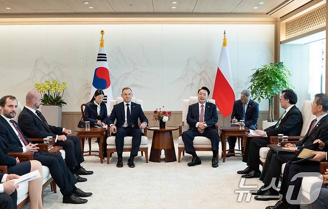 (서울=뉴스1) 송원영 기자 = 윤석열 대통령이 24일 서울 용산 대통령실에서 안제이 두다 폴란드 대통령과 한·폴란드 소인수회담을 하고 있다. (대통령실 제공) 2024.10.24/뉴스1