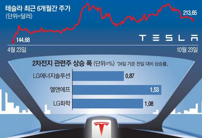 24일 국내 증시에서는 테슬라 가치사슬에 속하는 일부 2차전지 종목만 소폭 상승했다. 테슬라에 배터리를 공급하는 LG에너지솔루션은 전일 종가 대비 0.87% 오른 40만6500원으로 거래를 마쳤다. LG에너지솔루션에 양극재를 공급하는 LG화학은 1.08% 상승한 32만8000원을 기록했다.