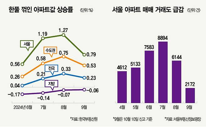 실제로 지난 9월 서울 아파트 실거래가격잠정지수는 -0.47%를 기록해 마이너스로 돌아섰다. 지난해 12월(-1.13%) 이후 9개월 만에 하락 전환했다. “가격 상승세 둔화로 매수 관망 심리가 견고해져 매물이 증가하고 거래가 감소하고 있다”는 것이 한국부동산원 진단이다.