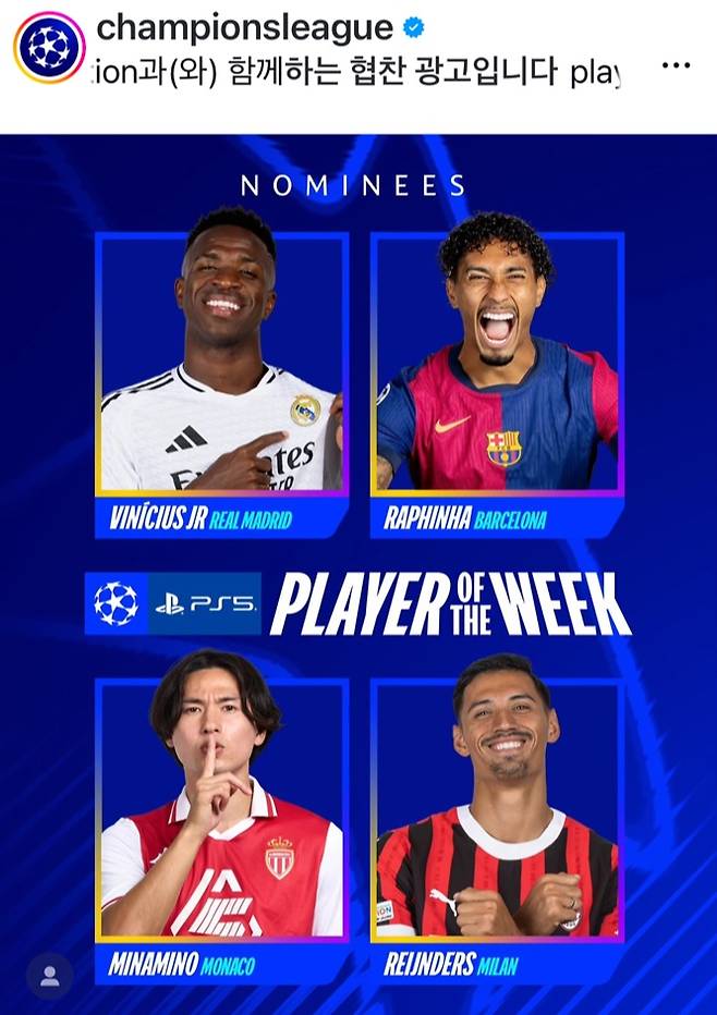 유럽축구연맹(UEFA) 챔피언스리그 홈페이지는 24일(한국시간) 공식 소셜 미디어 계정을 통해 '이주의 선수' 후보 4인의 이름을 공개했다. 여기서 미나미노는 비니시우스 주니오르, 하피냐, 티자니 라인더르스와 함께 UCL을 빛낸 선수로 인정받았다.