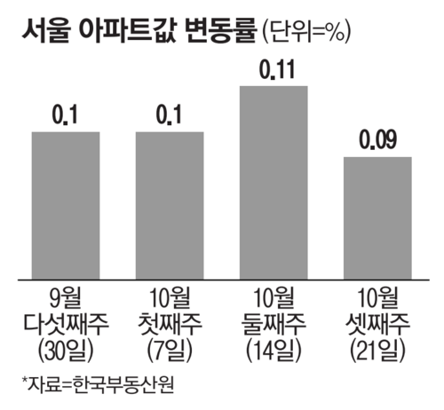 24일 한국부동산원이 발표한 10월 셋째주(21일 기준) 전국 주간 아파트가격 동향 조사 결과에 따르면, 이번주 서울 아파트값은 0.09% 오르며 31주 연속 상승했다. 금리인하 직후였던 지난주(0.11%)는 상승폭이 전주 대비 조금 올랐지만 이번주는 다시 둔화 양상을 보였다.
