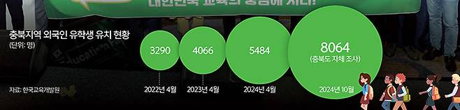 24일 한국교육개발원에 따르면 충북지역 외국인 유학생(4월 기준)은 2022년 3290명, 지난해 4066명, 올해 5484명이다. 충북도 자체 조사 결과에 따르면 이달 1일까지 도내 외국인 유학생은 8064명이다. 약 5개월 만에 47%(2580명)가 늘어난 것이다.