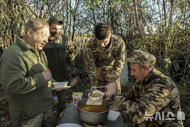 [차시우야르=AP/뉴시스] 우크라이나 제24 기계화여단 홍보실이 제공한 사진에 지난 23일(현지시각) 우크라이나 도네츠크주 차시우야르 전선 제24 기계화여단 소속 군인들이 야전 막사 주변에서 식사하고 있다. 2024.10.25.