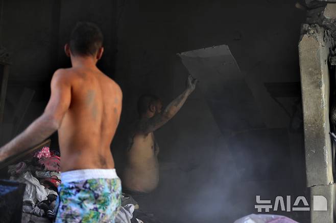 [티레=AP/뉴시스] 24일(현지시각) 레바논 남부 티레에서 주민들이 이스라엘 공습으로 파괴된 아파트 잔해를 치우고 있다. 2024.10.25.