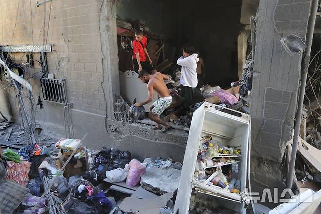 [티레=AP/뉴시스] 24일(현지시각) 레바논 남부 티레의 아파트 주민들이 이스라엘 공습으로 파괴된 잔해 속에서 본인들의 소지품을 수습하고 있다. 2024.10.25.