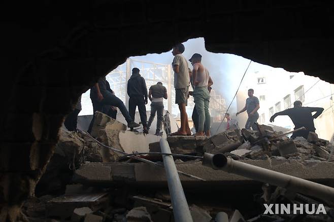 [가자지구=신화/뉴시스] 24일(현지시각) 가자지구 중부 알마가지 난민촌이 이스라엘의 공습을 받은 후 주민들이 파괴된 건물 주변에 모여들고 있다. 팔레스타인 보건부는 이스라엘의 공격으로 지금까지 숨진 팔레스타인 희생자 숫자는 4만2847명으로 늘어났다고 밝혔다. 2024.10.25.