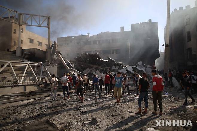 파괴 건물 주변에 모인 팔레스타인 주민들