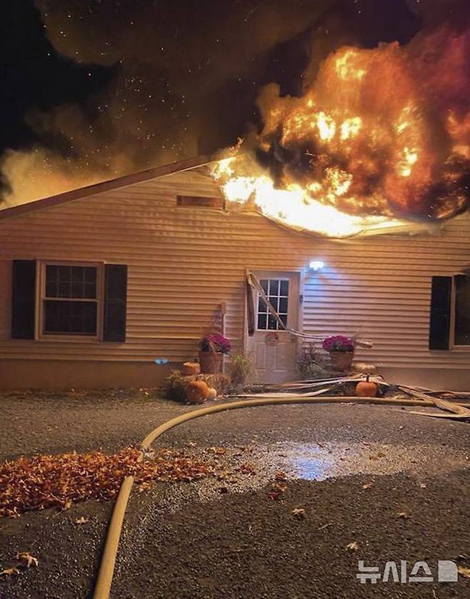 [캔턴=AP/뉴시스] 24일(현지시각) 미 뉴욕주 캔턴의 동물 보호단체 건물에서 불길이 솟고 있다. 현지 경찰은 동물 보호단체 '노 독스 레프트 비하인드'(No Dogs Left Behind) 건물에서 화재가 발생해 개 40마리가 죽었다고 밝혔다. 화재 원인은 조사 중이다. 2024.10.25.