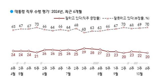 여론조사 전문기관 한국갤럽이 22~24일 실시한 조사에 따르면 윤 대통령 국정 수행에 대한 긍정평가 비율은 20%였다. 이 회사 조사 기준 윤 대통령 취임 후 최저치다. 반면 부정평가 비율은 70%로 최고치를 기록했다. 응답자 특성별로 봐도 여당의 핵심 지지층인 70대 이상이나 보수층에서조차 긍정 평가보다 부정 평가가 많았다. 국민의힘 지지층에서만 긍정 평가(48%)가 부정 평가(40%)보다 우세했다.