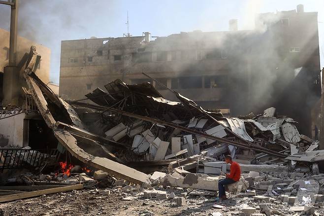 (마가지 AFP=뉴스1) 우동명 기자 = 24일(현지시간) 가자지구 마가지 난민 캠프에서 이스라엘 군의 공습을 받아 폭삭 무너진 건물이 보인다. 2024.10.25
