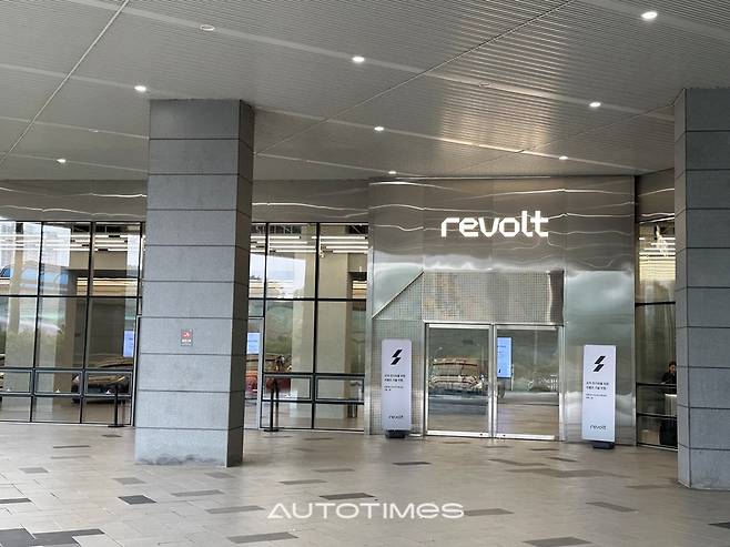 리볼트 쇼룸은 오토허브 건물 입구에 있다. 은빛 간판과 하얀 조명으로 하이테크 감성을 입힌 게 눈길을 끌었다. 여느 쇼룸이 그렇듯 전시장 벽면을 통유리로 구성해 밖에서도 다양한 차가 있다는 걸 한 눈에 확인할 수 있다. 매끈한 방수 페인트로 바닥을 칠하고 곳곳에 노출 콘크리트와 스테인리스 소재를 써서 성수동에서나 볼법한 카페 같은 분위기를 연출했다.