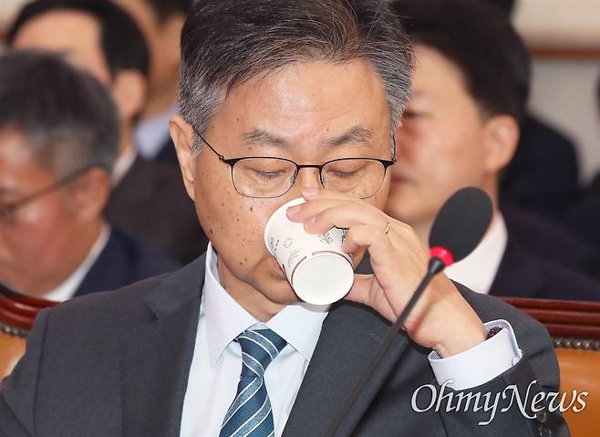 | ▲ 최재해 감사원장이 25일 서울 여의도 국회에서 열린 법제사법위원회 종합감사에 출석해 목을 축이고 있다. |