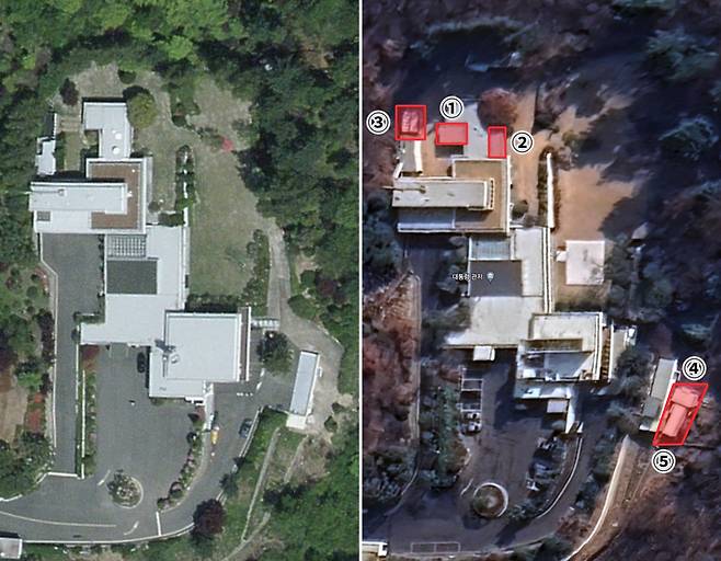 | ▲ 사진 왼쪽은 2022년 외교부 장관 관사 시절의 위성사진이며, 오른쪽은 2024년 구글어스 위성사진이다. 2년 사이 신고된 두번의 증축 이외에도 건물 3채가 더 확인된다. 공사 관계자에 따르면 ①번 건물은 '사우나' ②번 건물은 '드레스룸'이다. 2022년 8월 관저 2층 증축 공사를 한 것으로 총 면적은 약 45.53㎡(약 13.79평) 규모다. 관저 북동쪽에 위치한 ③번 건물은 가로 4미터, 세로 5미터로 20㎡(약 6평)면적으로 추정된다. 관저 서남쪽에 위치한 2채의 건물 중 ④번 건물은 가로 5.6미터, 세로 3.3미터로 18.5㎡(약 5.6평), ⑤번 건물은 가로 3.2미터 세로 8.3미터 24.9㎡(약 8평)으로 추정된다. 면적은 위성사진 상으로 측정한 것으로 실제 건물과 차이가 있다. |