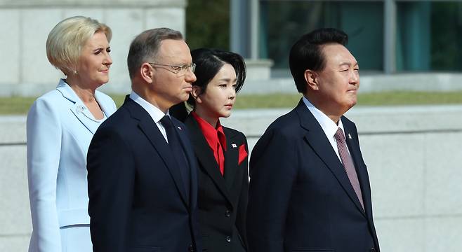 | ▲ 윤석열 대통령 부부, 폴란드 대통령 공식 환영식 윤석열 대통령과 김건희 여사가 24일 서울 용산 대통령실 앞 잔디마당에서 열린 안제이 두다 폴란드 대통령 국빈 방한 공식 환영식에서 국기에 경례하고 있다. |