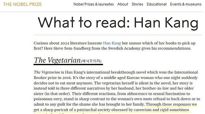 채식주의자는 평범했던 중년 여성이 어느 날 육식을 거부하면서 벌어지는 일입니다. 주인공은 고기를 억지로 먹이려는 가족과 대립하기도 하고, 점점 변해가는 주인공의 모습에 매력을 느낀 형부와 부적절한 관계를 갖기도 합니다. 육식이란 관행을 거부하자 가족들은 혐오와 성적 매혹, 질투심 등 반응을 보인 건데, 노벨위원회는 이를 통해 출세주의와 경직되고 때로는 독재적인 사회 규범과 관습에 매몰된 가부장 사회를 날카롭게 묘사했다고 평가했습니다.
