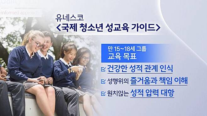 유네스코는 이런 상황에서 어른들의 판단을 도울 수 있도록 <국제 성교육 가이드(International technical guidance in sexuality education, 2018)>를 발표한 바 있습니다. 청소년을 4개 연령 그룹으로 구분한 다음 총 8가지 핵심 개념(관계, 폭력, 젠더, 섹슈얼리티 등)에서 각각의 그룹이 마땅히 성취해야할 교육 목표를 제시하는 것입니다.