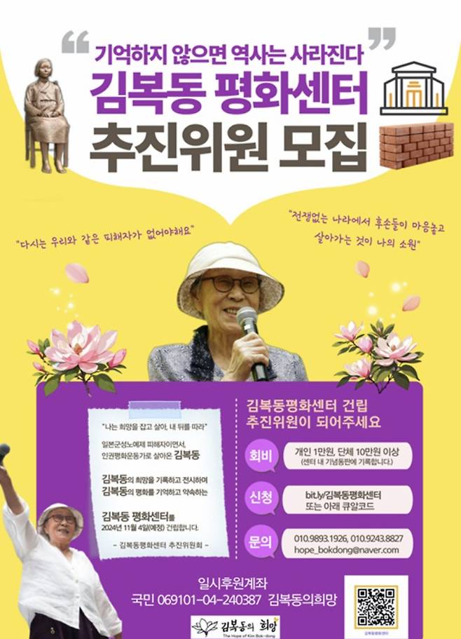 한편, 김복동의 희망은 일회성 후원을 통해 참여할 수 있는 김복동 평화센터 건립 추진위원회를 모집하고 있으며, 다음달 4일 개관식을 진행할 계획입니다.