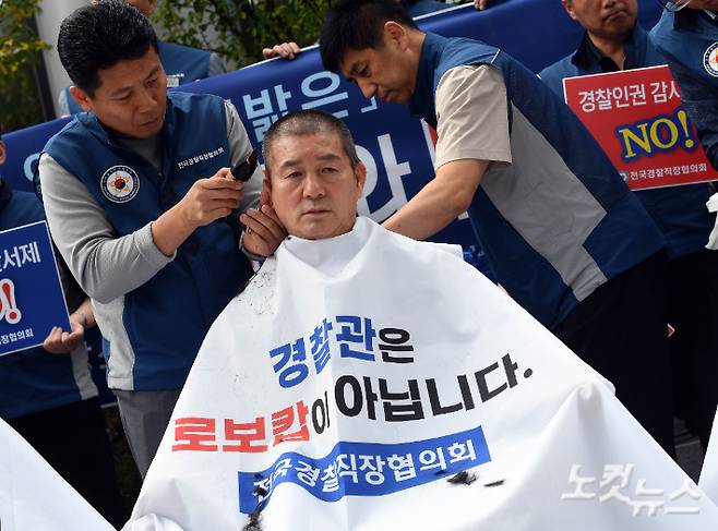 전국경찰직장협의회가 21일 오후 서울 서대문구 경찰청 앞에서 '경찰청의 GPS감시와 밀어내기 순찰 규탄' 기자회견 후 삭발을 하고 있다. 이들은 성명서에서 "우리가 나서는 이유는 하위직 현장 경찰관들에 대한 처벌 목적의 이중 감시 체계가 경찰관들을 심리적으로 압박해 자존감과 사기를 떨어뜨려 치안 서비스의 질이 하락하고 그 피해가 고스란히 국민의 몫이 될 것이 자명하기 때문"이라고 말했다. 황진환 기자