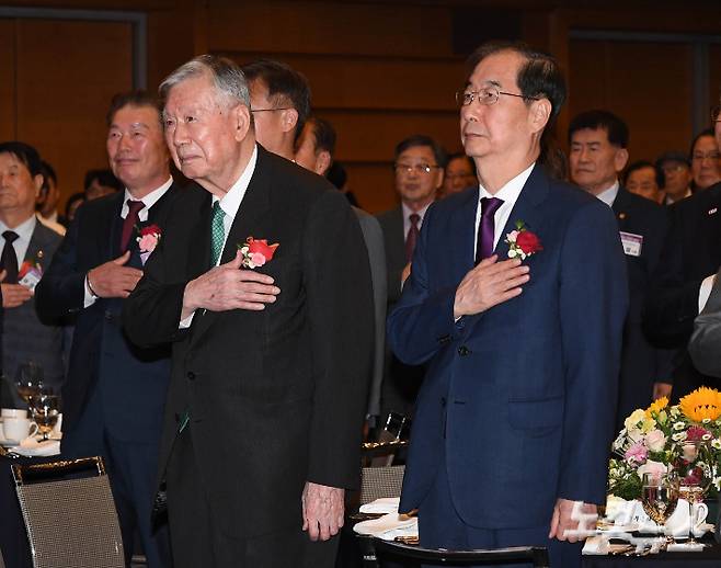 대한노인회 이중근 신임 회장과 한덕수 국무총리가 21일 오전 서울 중구 대한상공회의소에서 열린 '19대 대한노인회장 취임식' 에 참석해 국기에 대한 경례를 하고 있다. 이 회장은 이날 제19대 노인회장으로 취임하며 "초고령화 사회가 된 대한민국의 근본적인 노인 인구 관리를 위해 노인 연령을 연차적으로 상향 조정하겠다"고 밝혔다. 황진환 기자