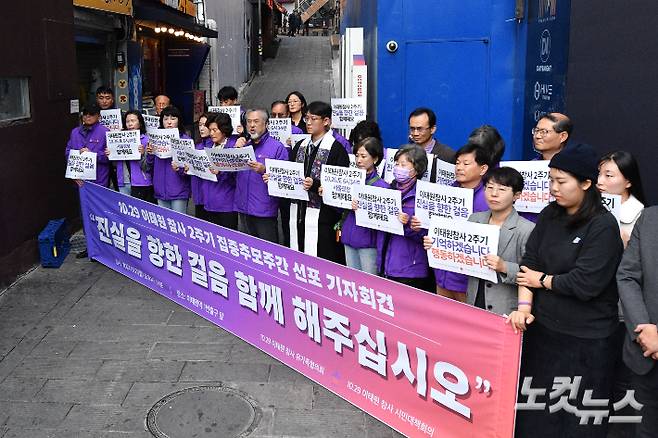 21일 오후 서울 용산구 이태원역 1번 출구 앞에서 열린 10.29 이태원 참사 2주기 집중추모주간 선포 기자회견에서 이정민 10.29 이태원참사 유가족협의회 위원장이 발언하고 있다. 이태원참사 유가족협의회와 시민대책회의는 이날 참사 현장인 '10.29 기억과 안전의 길'(이태원역 1번출구 앞)에서 2주기 집중추모주간을 선포하고 관심과 연대를 호소했다. 류영주 기자