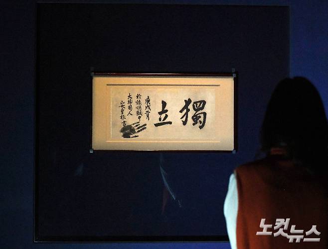 23일 오후 서울 종로구 대한민국역사박물관에서 열린 안중근 의사 하얼빈 의거 115주년 기념 특별전시 '안중근 書' 전시관에 '독립'이라고 적힌 안 의사의 유묵이 전시돼 있다. 황진환 기자