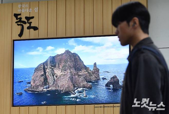 독도의 날인 25일 서울 종로구 광화문역에 최근 철거된 독도 조형물 대신 걸린 벽걸이 TV로 실시간 독도 영상이 표출되고 있다. 류영주 기자