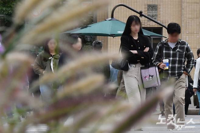 전국 대부분 지역의 아침 기온이 10도 안팎으로 떨어져 쌀쌀한 날씨를 보이는 21일 오전 서울 종로구 광화문네거리에서 시민들이 출근을 하고 있다. 류영주 기자