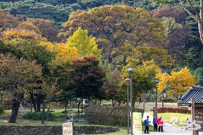 가을까지 기승을 부린 늦더위로 단풍 절정 시기가 늦어지고 있는 가운데 25일 경기 광주시 남한산성을 찾은 시민들이 늦은 단풍을 즐기고 있다. 광주(경기)=박종민 기자