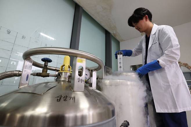 한국삽살개재단 동물병원 질소탱크에 삽살개의 정액이 영구 보존되고 있다.
