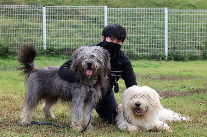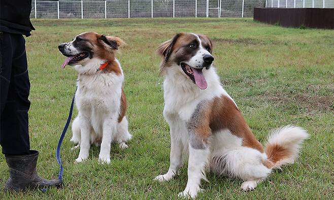 삽살개 ‘태택(백삽사리, 장모)’과 ‘슬인(청삽사리, 장모)’이 운동장에서 뛰어놀고 있다.