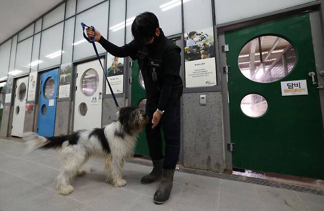 한국삽살개재단 내부에 있는 동물병원에서 수의사가 삽살개 새끼로부터 DNA 검사를 위한 시료를 채취하고 있다.