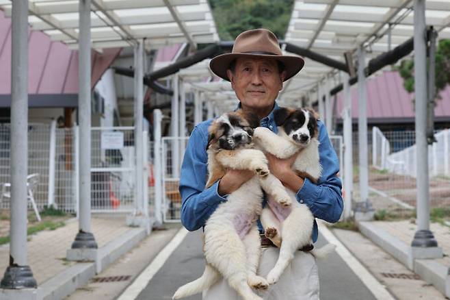하지홍 한국삽살개재단 이사장이 단모 바둑이 새끼를 안고 포즈를 취하고 있다.