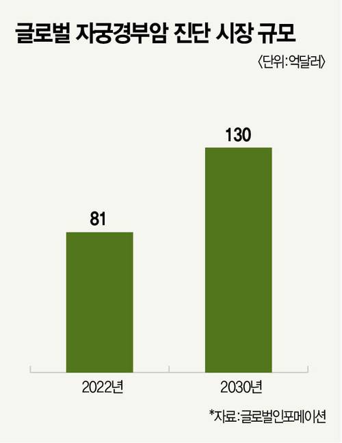 이 검사는 한 여성이 HPV 유전자 검사에서 고위험군 양성으로 나왔을 때 자궁경부암 발생 관련 단백질 바이오마커(p16·Ki-67)를 확인하는 과정을 거친다. 두 가지 바이오마커를 견줘 암 위험도를 확인하기 때문에 ‘이중면역염색검사’라고도 한다. 로슈가 미국 식품의약국(FDA)과 유럽 CE 인증을 획득한 유일한 검사인데 여기에 바이오다인 기술이 포함돼 있다. 이 때문에 로슈가 잘되면 덩달아 바이오다인도 잘되는 구조가 형성됐다. 시장조사기관 글로벌인포메이션에 따르면 세계 자궁경부암 진단 시장은 지난해 81억달러(약 10조9000억원), 2030년에는 130억달러(약 17조5000억원)로 훌쩍 커질 전망이다.