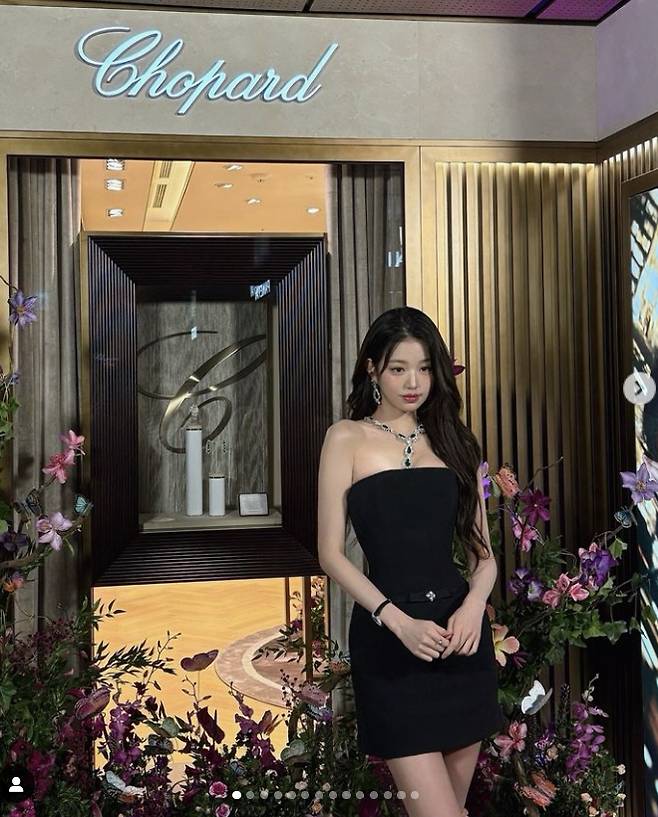 소매가 없는 브라톱 상의의 초미니 블랙 드레스를 선택한 장원영은 화려한 주얼리를 과시하며 행사장에 나섰다.