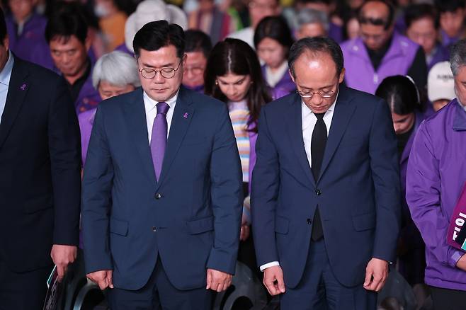 그래서인지 정부·여당을 향한 시민들의 눈초리는 매서웠다. 추경호 국민의힘 원내대표가 추모사를 위해 무대에 오르자, 시민들은 추 원내대표가 발언하는 3분 내내 "내려가", "국민의힘이 여길 어디라고 오나"라며 거친 욕설과 야유를 보냈다. "정치하는 사람이기 이전에 자식을 둔 아버지로서 우리 이웃의 아들과 딸들을 지켜주지 못한 것이 너무나 미안하다"고 한 추 원내대표는 2시간 30분여 진행된 이날 추모대회 끝까지 자리를 지켰다. 이날 추모대회에는 오세훈 서울시장, 유승민 전 의원 등이 여권에서 함께 했다. 야권에선 박찬대 원내대표를 비롯한 수십 명의 의원들이 참석했다.