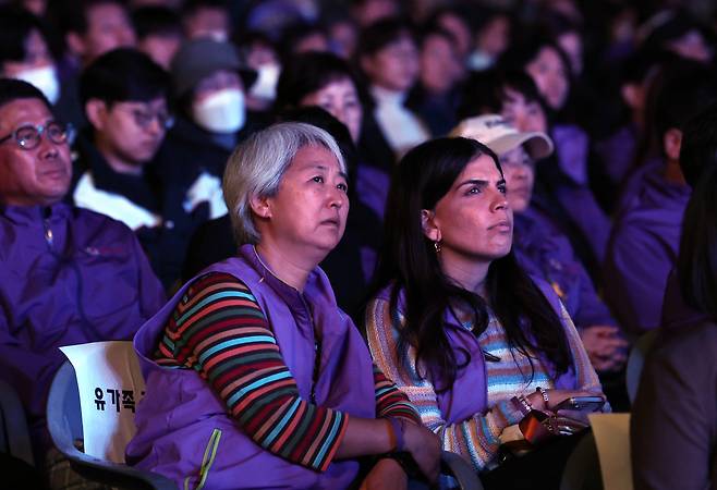 26일 오후 서울광장. 이태원 참사로 희생된 호주인 고 그레이스 라쉐드(Grace Rached)씨의 어머니 조안 라쉐드(Joan Rached)씨가 영어로 된 편지를 읽다 울먹이자, 광장에 모인 시민들과 이태원 참사 유가족들도 함께 울었다. 맨 앞줄 지정석에 앉은 여야 정치인들도 정쟁을 멈추고 잠시 함께 고개를 떨궜다.