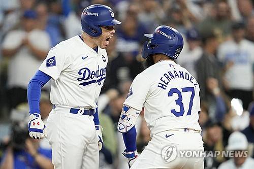 Los Angeles Dodgers' Teoscar Hernández celebrates his two-run home run with Freddie Freeman against the New York Yankees during the third inning in Game 2 of the baseball World Series, Saturday, Oct. 26, 2024, in Los Angeles. (AP Photo/Ashley Landis)