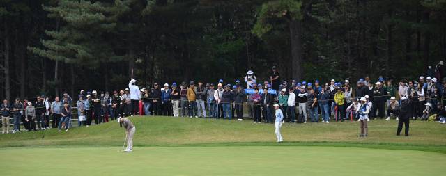 한국여자프로골프(KLPGA) 투어 '덕신EPC·서울경제 레이디스 클래식' 최종 라운드가 열린 27일 경기 용인 88CC를 찾은 많은 갤러리들이 유현조, 윤이나, 최예림 조의 9번 홀 경기를 숨죽인 채 관전하고 있다. 용인=오승현 기자 2024.10.27