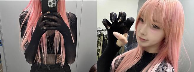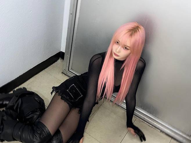 올블랙 패션으로 시크함을 연출해냄과 동시에 핑크 머리색으로 포인트까지 주며 지젤만의 매력을 선보였다.