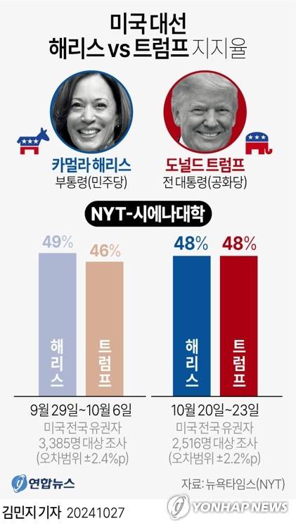 (서울=연합뉴스) 김민지 기자 = 뉴욕타임스(NYT)와 시에나대학이 지난 25일(현지시간) 공개한 여론조사 결과에서 미국 민주당 대통령 후보 카멀라 해리스 부통령과 공화당 후보 도널드 트럼프 전 대통령의 전국 단위 지지율은 48% 대 48%로 동률이었다.